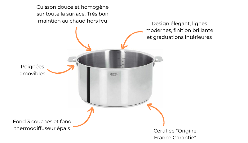 Ces casseroles inox Cristel sont appréciées pour leur design élégant, leurs lignes modernes ainsi que leur finition brillante. Elles disposent également de graduations intérieures. Enfin, la collection Casteline est totalement garantie à vie et est certifiée « Origine France Garantie ».