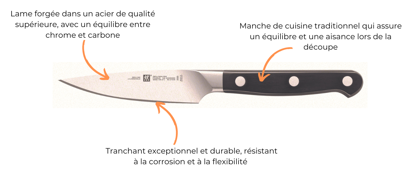 Un bon couteau passe par une bonne sélection de l’acier. Zwilling s’appuie sur un acier spécial appelé « Zwilling Sonderschmelze » qui représente un équilibre entre chrome et carbone. Cette création permet une lame en acier de qualité supérieure. Elle est également résistante à la corrosion et dispose d’une qualité de découpe exceptionnelle.
