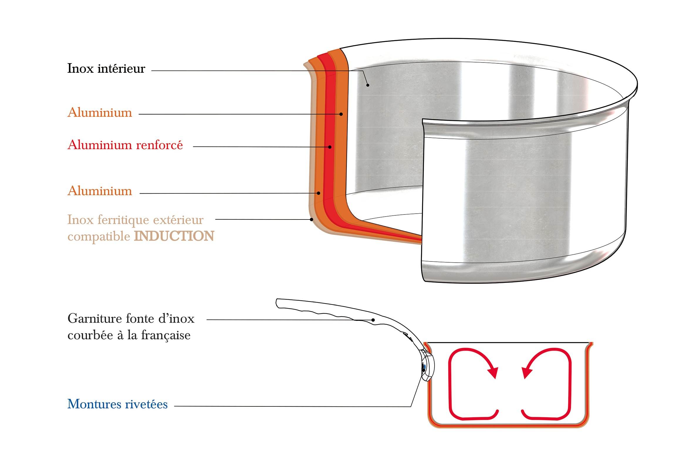 Tout d'abord, ils disposent d'un inox ferritique extérieur pour la durabilité et l'hygiène. Ensuite, ils disposent d'une alternance de 3 couches d'aluminium qui assure une connectivité thermique exceptionnelle, équivalente au cuivre. Enfin, ils disposent d'un inox intérieur pour terminer cette combinaison multicouches.