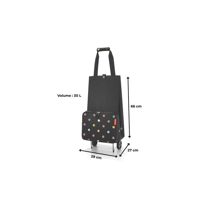 Replié en 3, le chariot de courses se range directement dans sa pochette. De plus, ses roues sont rétractables pour un pliage facile. Dimensions plié : 32,5 x 25 x 6,5 cm.