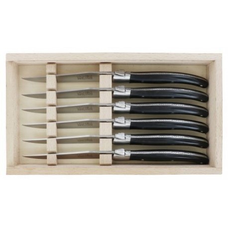 Les couteaux, dotés de lames lisses en acier trempé, de mitres en inox massif et de manches en ébène, sont présentés dans un plumier 6 couteaux, offrant ainsi un coup de cœur garanti pour toute cuisine raffinée.