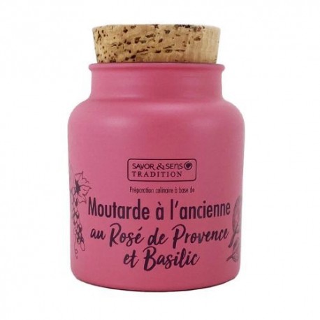 Découvrez la moutarde à l'ancienne au rosé de Provence, une création unique qui marie la force de la moutarde à l'ancienne à la fraîcheur du pistou et à la douceur du vin rosé provençal.
