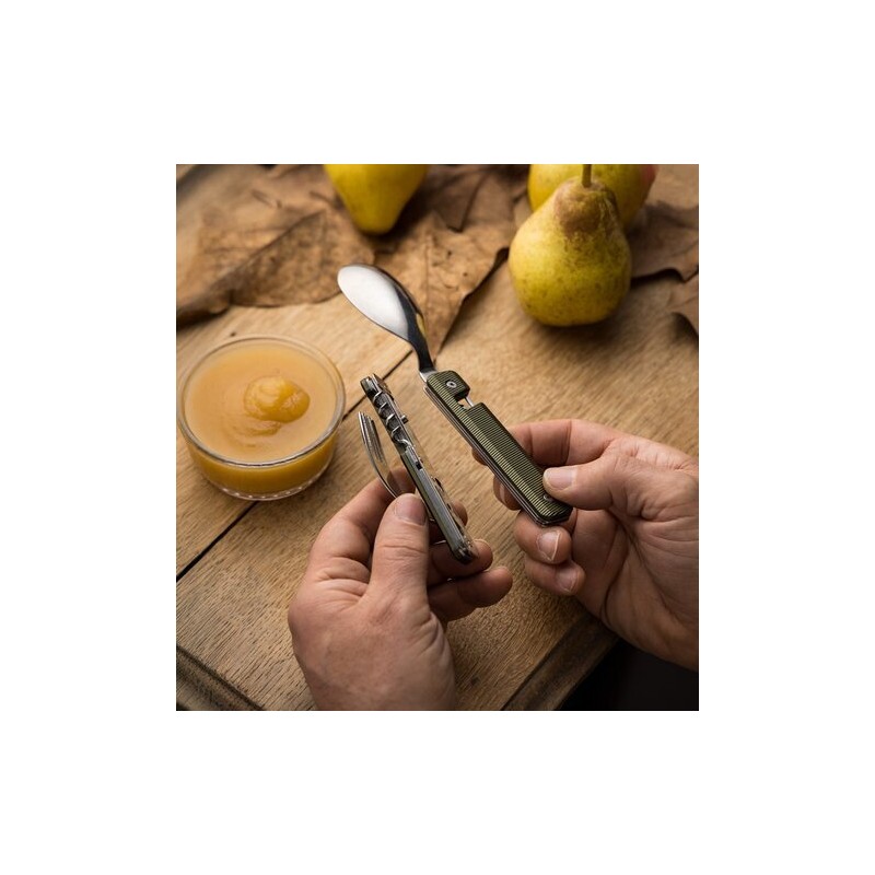 Bien plus qu’un simple kit de couverts nomades, ce modèle regroupe six fonctions essentielles :