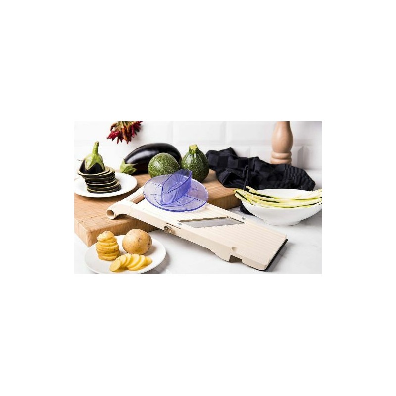 Le grand avantage de cette mandoline japonaise Benriner Premium 95 mm, c’est son équilibre entre précision extrême et sécurité. La lame en inox trempé affûtée permet de trancher sans effort. Cela limite la pression à exercer et améliore la régularité des tranches. Combinée aux lames julienne, elle permet de passer en un instant d’un carpaccio de radis à des bâtonnets croquants. Le poussoir ergonomique très enveloppant, vous permet de travailler vite sans vous soucier de vos doigts (même en fin de légume).