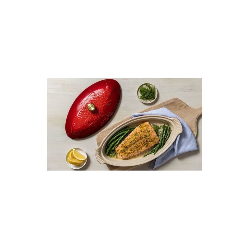 Sa silhouette ovale, son motif embossé en forme de poisson et son bouton doré en font une pièce à la fois pratique et raffinée, parfaite pour passer du four à la table avec élégance.