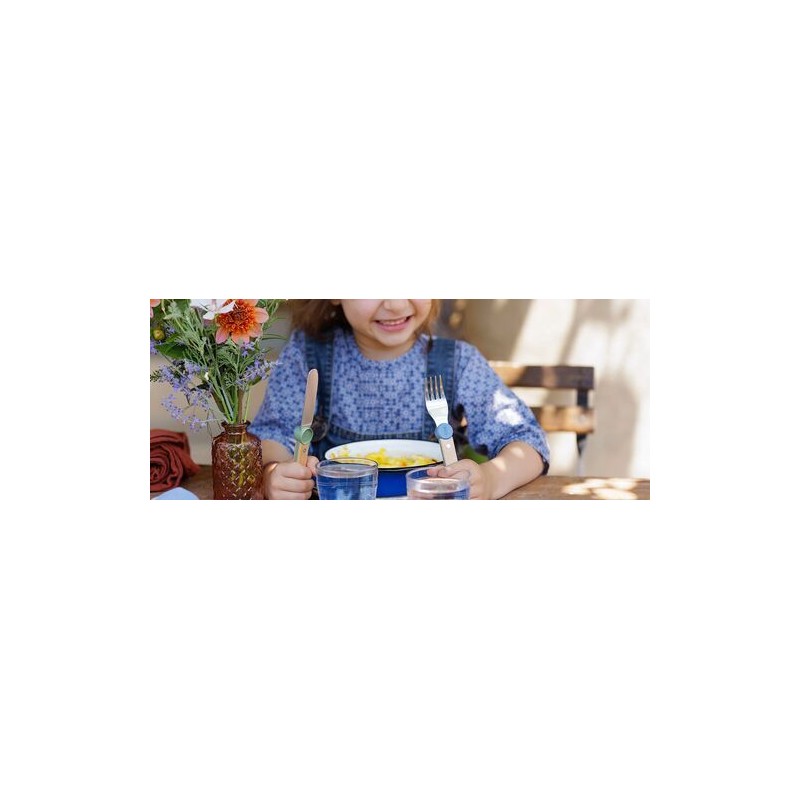 Le couteau non tranchant, la fourchette douce et la cuillère arrondie sont parfaitement dimensionnés pour les petites mains.