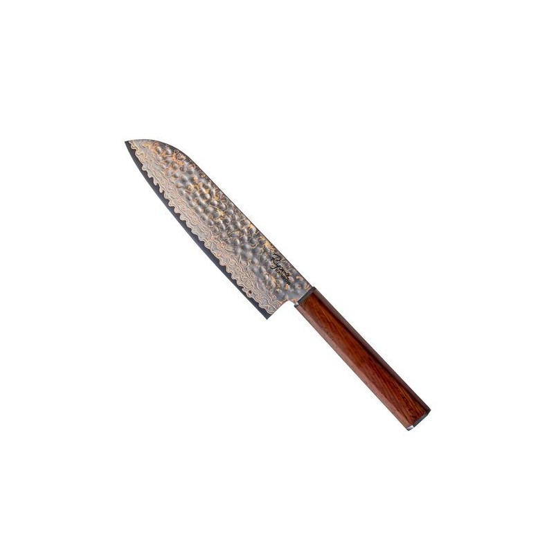 Le Santoku, littéralement « trois vertus », est la lame polyvalente par excellence. Il excelle dans la découpe de légumes, de fruits, de viandes ou encore de poissons. Sa lame large, fine et arrondie permet une gestuelle fluide, idéale pour les découpes en aller-retour ou en hachage.Une lame en damas coloré unique au monde