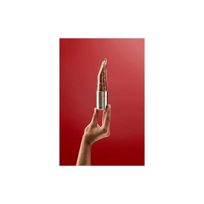 Ce moulin à piment en verre et inox est conçu pour révéler toute l’intensité des piments séchés. Contrairement à un moulin classique, il coupe finement le piment au lieu de l’écraser. Cette action permet de libérer les huiles essentielles et de préserver la richesse aromatique. Son design transparent permet de visualiser le contenu et d’ajuster facilement le dosage à table comme en cuisine.