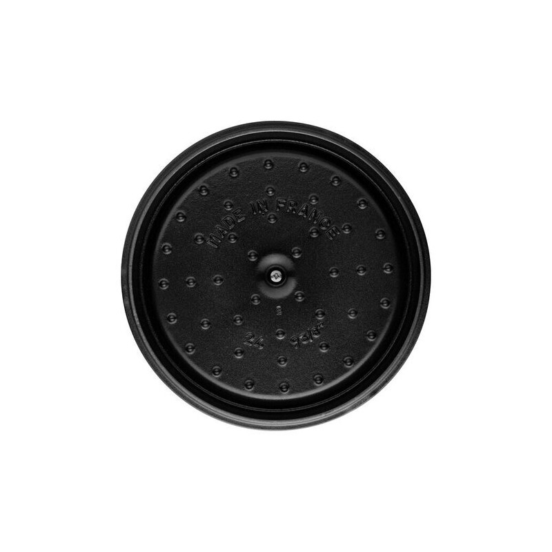 L’intérieur émaillé noir mat est la signature Staub. Il est particulièrement adapté aux cuissons à température élevée, facilitant la saisie et la caramélisation des aliments. Sa résistance à l’usure permet une utilisation régulière, tout en simplifiant l’entretien après usage. La cocotte peut également être utilisée à froid, par exemple après un passage au réfrigérateur, afin de maintenir la fraîcheur lors du service.
