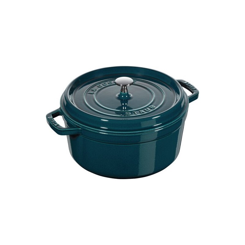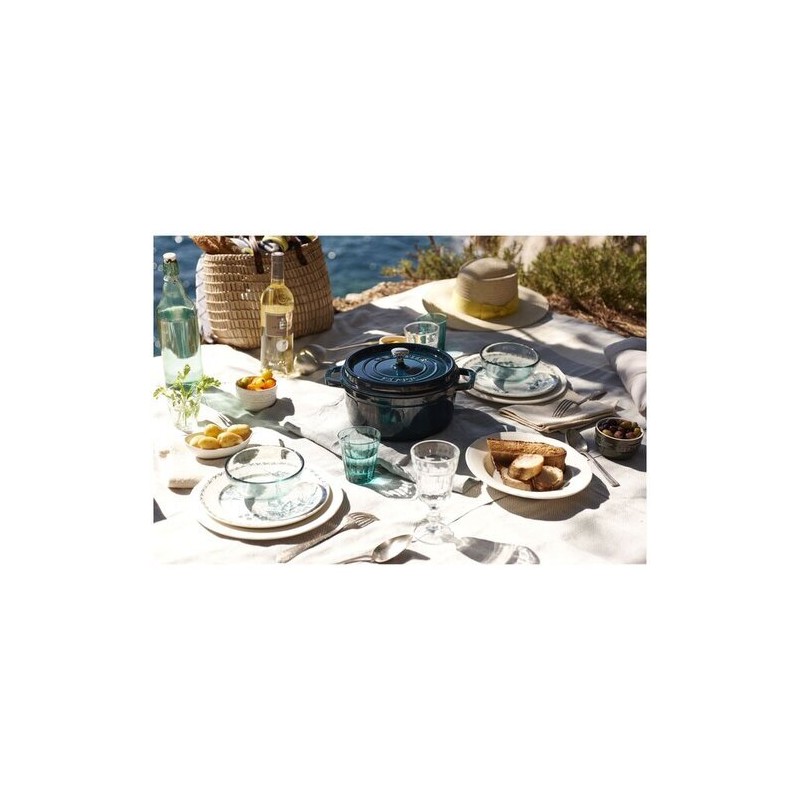 La cocotte en fonte ronde Staub La Mer Ø 28 cm est pensée pour cuisiner en grande quantité avec précision. Sa capacité de 6,7 litres permet de préparer des plats pour 6 à 7 personnes, tout en conservant une cuisson homogène. Réalisée en fonte émaillée, elle assure une diffusion lente et régulière de la chaleur, idéale pour les plats mijotés, les rôtis, les volailles entières ou la cuisson du pain. Son coloris La Mer, obtenu grâce à la finition Majolique, apporte une profondeur et une brillance remarquables.