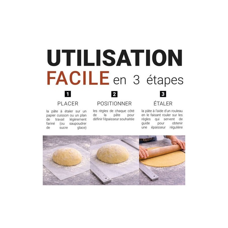 Le lot comprend trois formats complémentaires, adaptés à chaque usage. Les règles de 3 mm conviennent aux pâtes très fines comme les sablés ou le feuilletage. Les modèles de 5 mm sont idéaux pour des abaisses standards, tandis que les règles de 10 mm permettent de travailler des préparations plus épaisses comme les cookies ou les inserts.