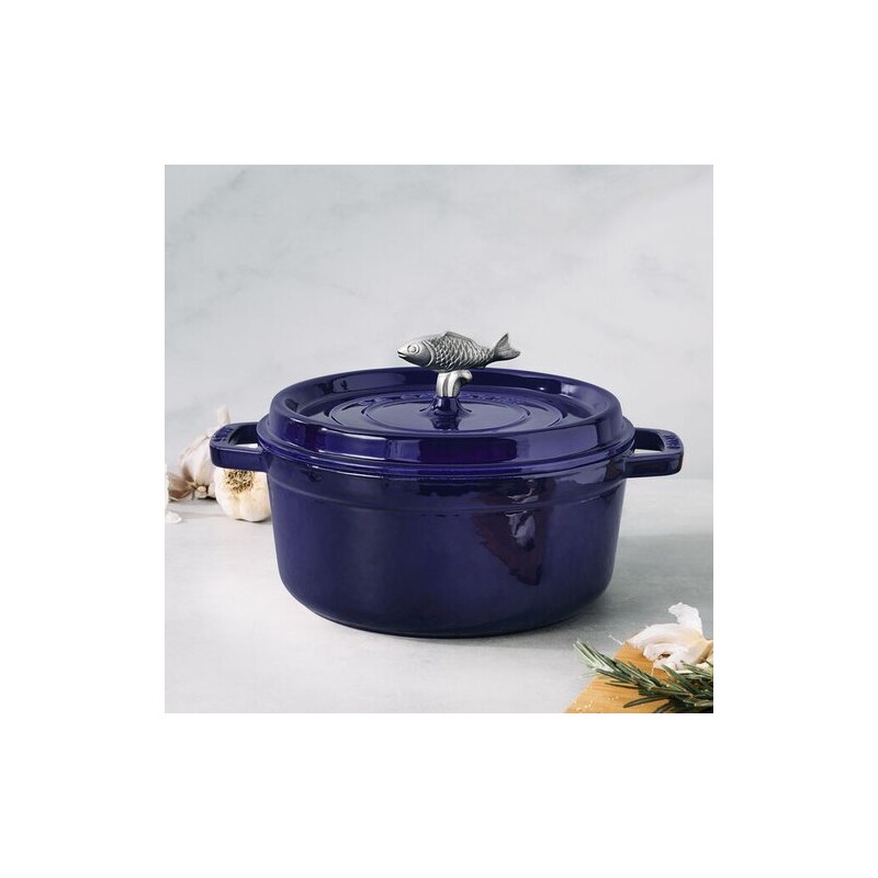 Sa finition argentée capte la lumière et met en valeur les teintes profondes des cocottes Staub. Ce contraste visuel renforce l’élégance du service, que ce soit en cuisine ou directement à table. Inspiré de l’univers culinaire, ce motif poisson s’intègre parfaitement dans une cuisine tournée vers le goût et le détail.