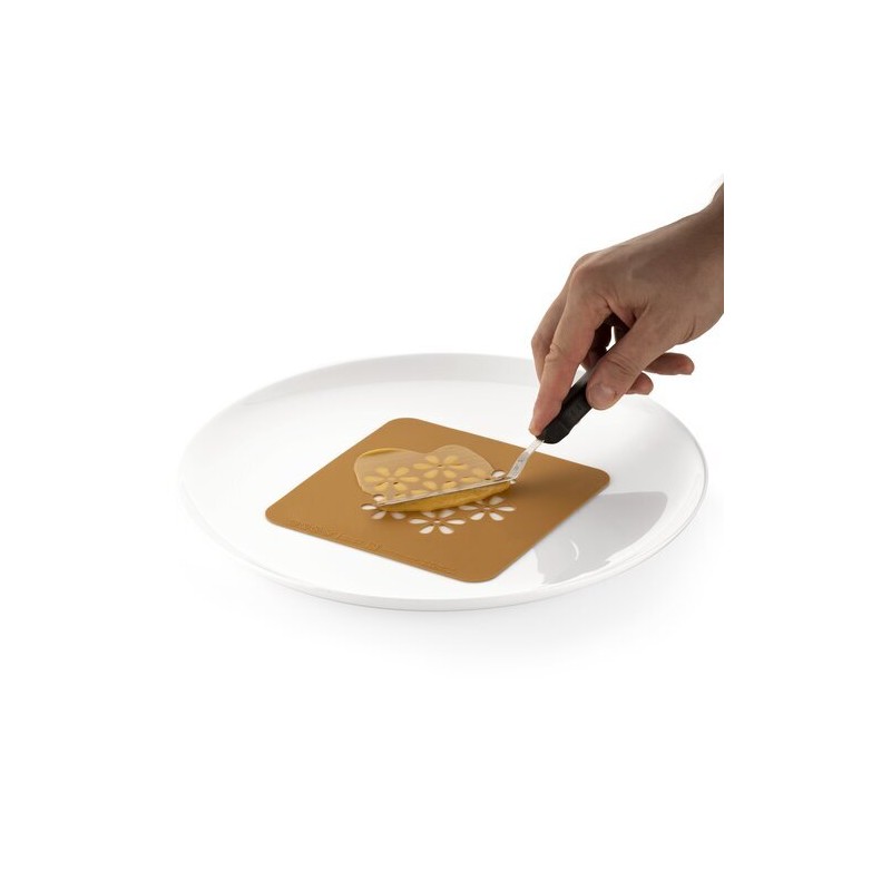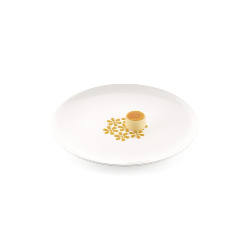 Le pochoir sakura permet de réaliser rapidement des décors nets et équilibrés. Il suffit de le positionner sur l'assiette, d'appliquer une crème, un gel ou une poudre, puis de le retirer pour révéler un motif floral précis. Cette technique simple permet d'obtenir un rendu professionnel en quelques secondes.