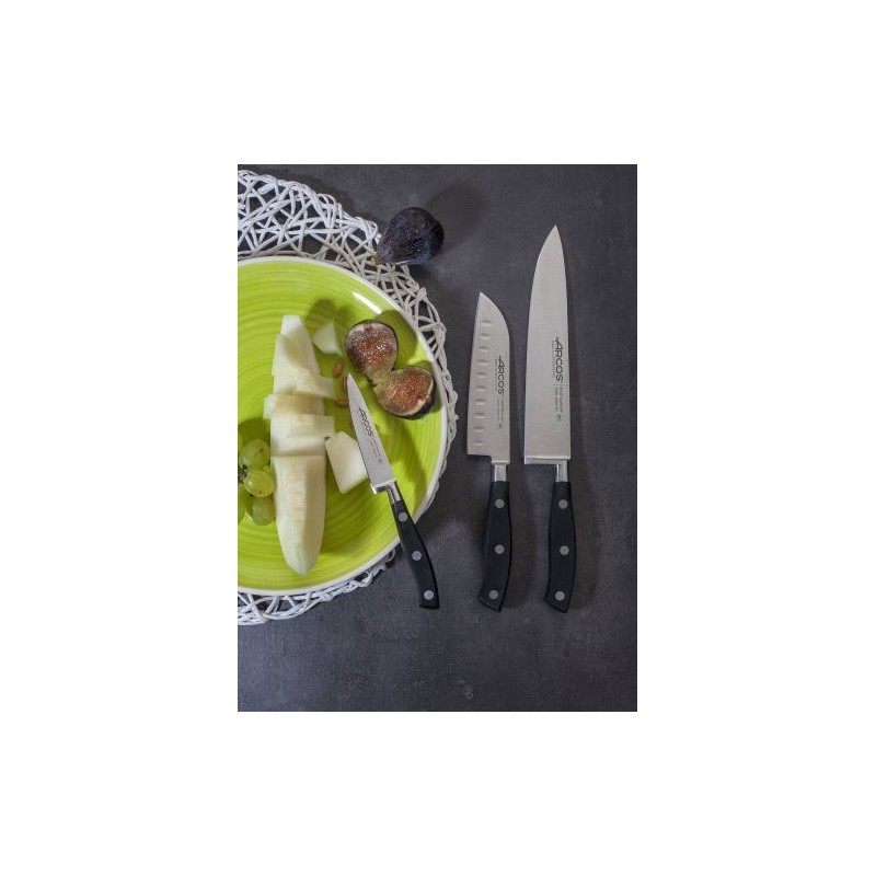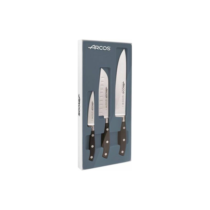 Le coffret de couteaux Arcos Riviera rassemble les couteaux de cuisine essentiels à avoir dans sa cuisine. Il est composé d'un couteau d'office 10 cm, d'un couteau Santoku alvéolé 14 cm et d'un couteau de chef 20 cm. Avec ces 3 pièces, vous pourrez réaliser toutes les découpes que vous souhaitez lors de vos préparations les plus complexes.