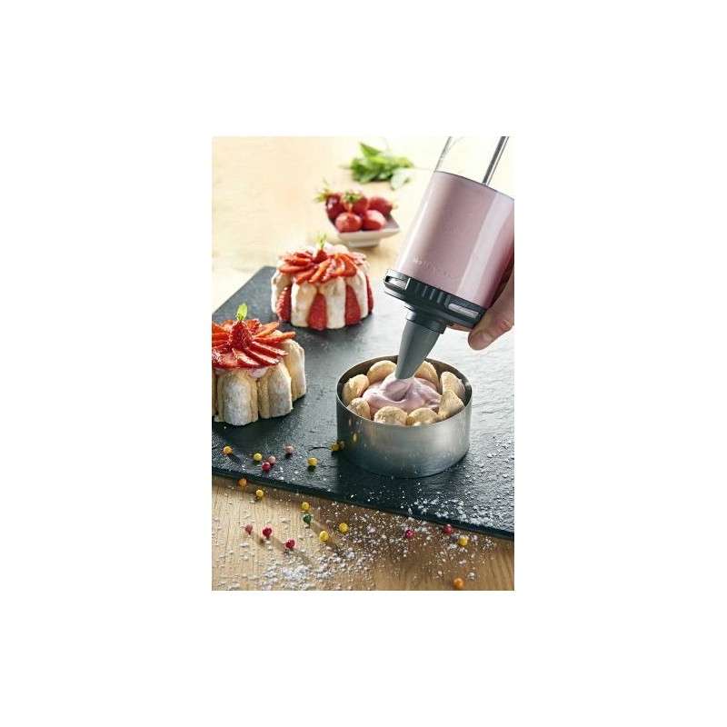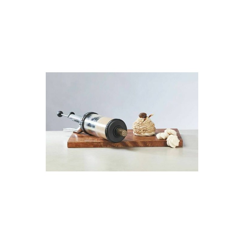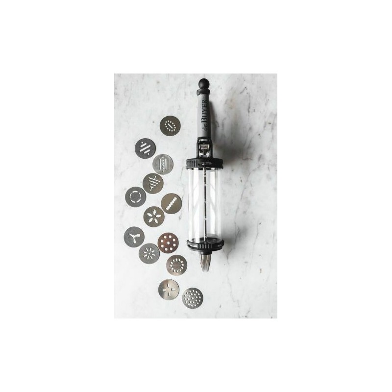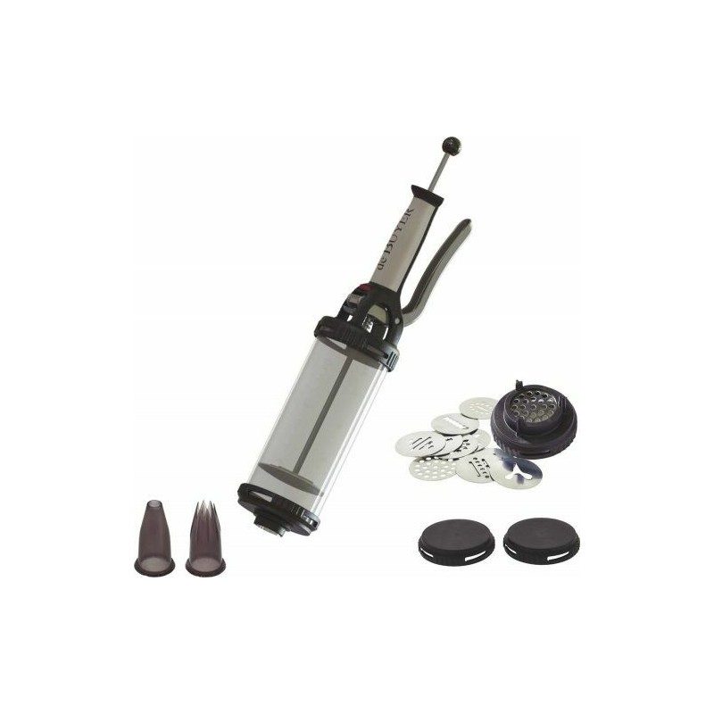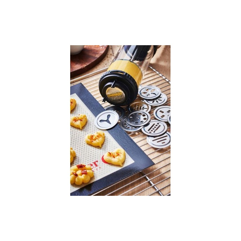 Livré avec une douille unie et une cannelée ainsi qu'avec un kit spécial sablé composé de deux couvercles hermétiques, d'un bouchon/support disque et de treize disques en acier inoxydable pour la réalisation de sablés variés, originaux et de pâte à choux.