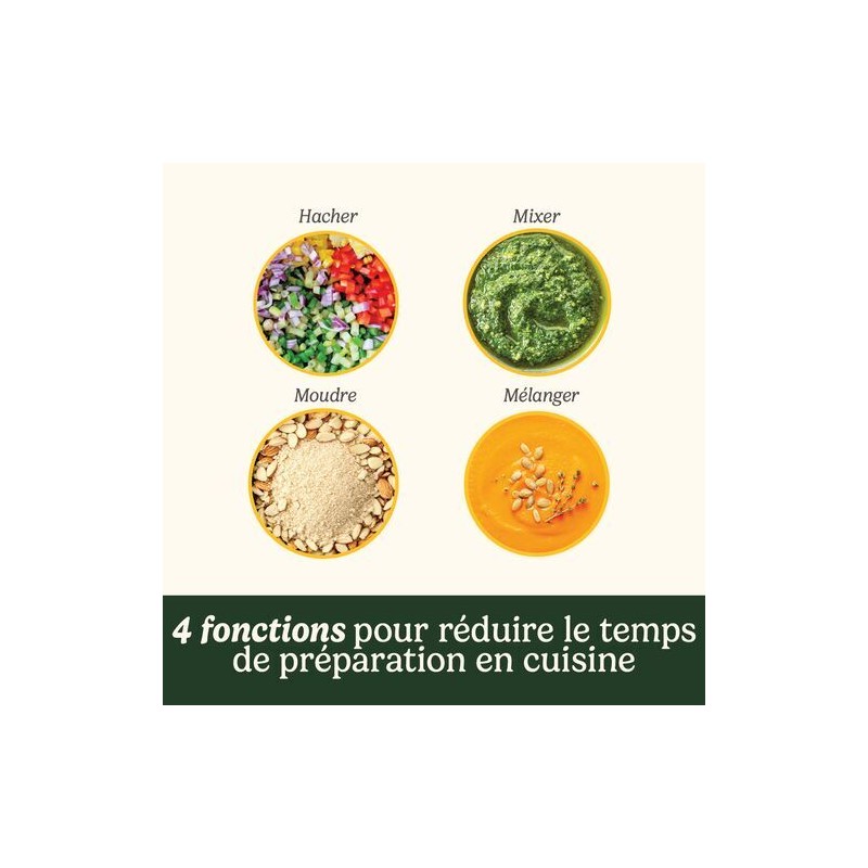 Sa lame unique en acier inoxydable de haute qualité, tourne dans les deux directions, pour mixer ou hacher dans un sens, pour broyer dans l'autre sens.